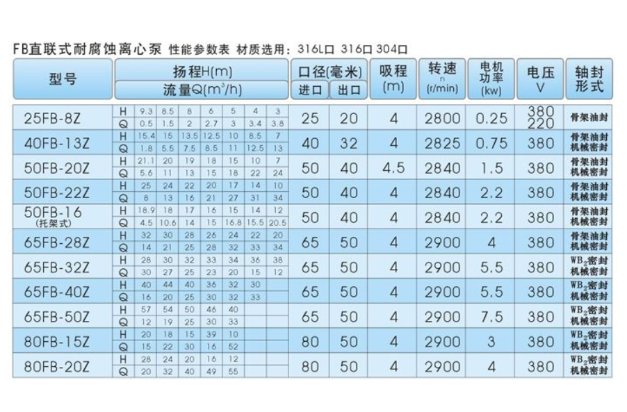 FB型耐腐蝕泵具有性能穩(wěn)定可靠,密封性能好,外觀(guān)美觀(guān),使用檢修方便,泵體、泵蓋、葉輪、軸套等主要零部件均采用不銹鋼材料制造。FB型采用機(jī)械密封裝置,根據(jù)需要選用單端面或者雙端面機(jī)械密封,密封腔內(nèi)通入有一定壓力的水沖洗摩擦端面起冷卻作用,介質(zhì)溫度在-20℃ ~ 130℃范圍之間,流量:2-400m3/h;,揚(yáng)程:10-105m。